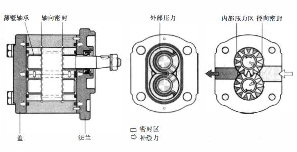 在输压力油的齿轮齿之间的间隙末端,由轴承实现密封。通过将工作压力引入轴承后部,可控制齿轮齿和铀承之间的密封区。特殊密封为该区域的边界。齿轮齿尖的径向间隙由内力密封,此内力将齿尖紧压在外壳之上。