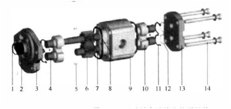 1一挡圈;2一轴封;3一前盖;4一滑动轴承;5一定心销;6一齿轮;7一齿轮(主动);8一外先密封;9一泵外壳;10一轴承:11一轴向密封区;12一支架;13一端盖;14一固定螺钉