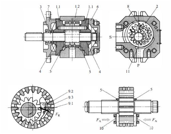 1. 1一泵体;2一轴承荒;2一内齿圈;3一小齿轮轴;4一滑动轴承;5一轴向板;6一端盖;7一安装法兰;8一止挡销;9一配油盘组件;9一配油盘;9.2一配油盘架;9.3一密封辊;10一压力区;11一液压静压轴承
